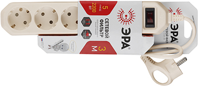 Сетевой фильтр пятиместный 3 м USF-5es-3m-I "Эра" (ПВС, 10 А, базовый уровень защиты), с заземлением, с выключателем, слоновая кость