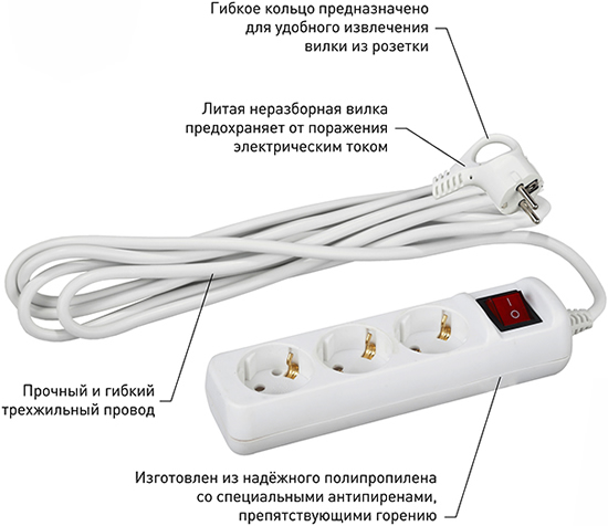 Удлинитель бытовой с заземлением предназначен для подключения электроприборов и электроинструментов мощностью до 3,5 кВт.