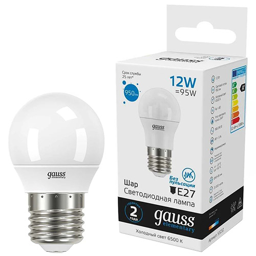 Лампа светодиодная Gauss 53232 Elementary (G45 шар, E27, 12 Вт, 950 лм, 6500 К)