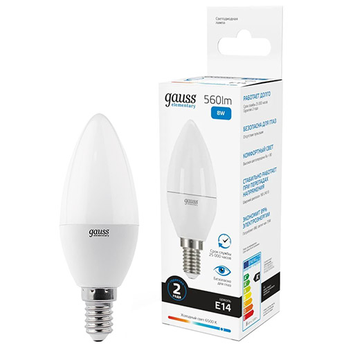 Лампа светодиодная Gauss 33138 Elementary (C37 свеча, E14, 8 Вт, 560 лм, 6500 К)