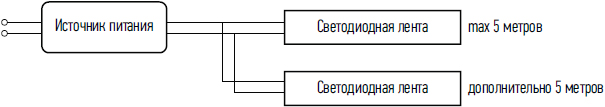 Р = Рленты х Lдлина ленты. Р = 6,0 Вт/м х 5 м = 30 Вт.