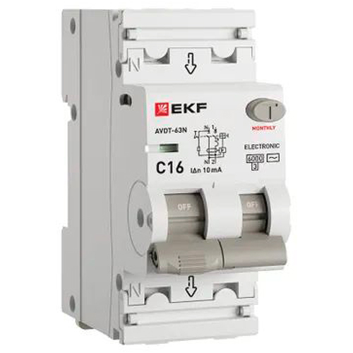 Автоматический выключатель дифференциального тока АВДТ-63N 1P+N 16А EKF PROxima (16 А, характеристика C, тип AC электронный, 10 мА, 6 кА)